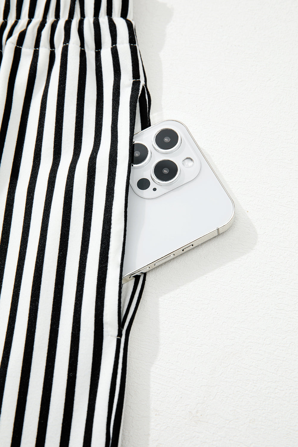 - Elevate casual look with these pants, featuring a trendy striped pattern and charming frill detailing for a touch of flair.